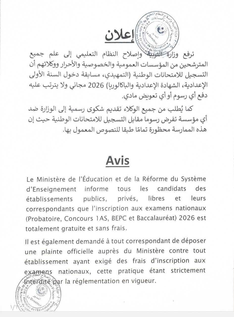 أصدرت وزارة التربية وإصلاح النظام التعليمي بلاغاً أكد فيه حظر فرض أي رسوم مالية على التلاميذ مقابل التسجيل في الامتحانات الوطنية لعام 2026.