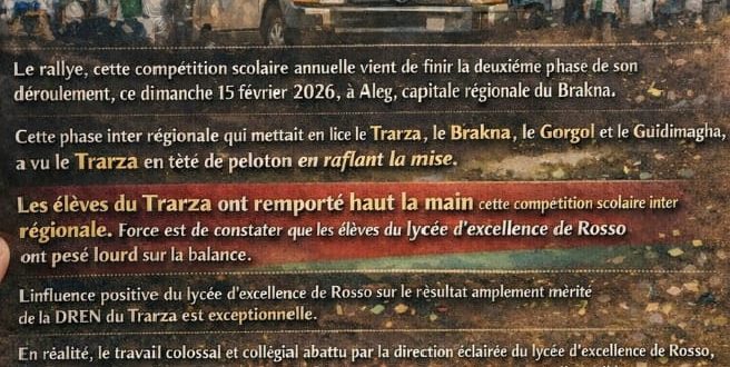 Le rallye, cette compétition scolaire annuelle vient de finir la deuxième phase de son déroulement , ce dimanche 15 février 2026 , à Aleg, capitale régionale du Brakna.